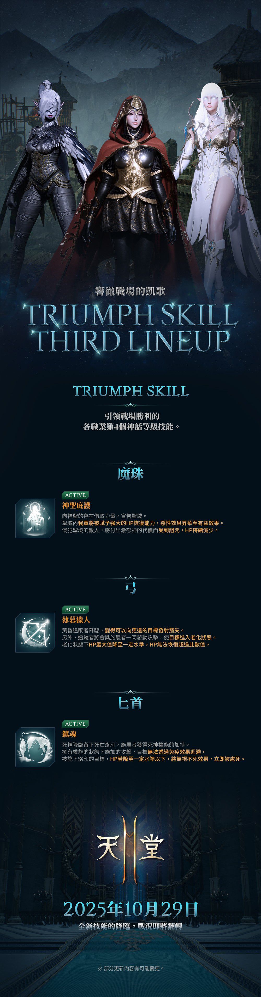 TRIUMPH SKILL THIRD LINEUP:魔珠、弓、匕首 2025-10-29 維修後 ~ 2025-11-05 維護前 原始情報位置:https://tw.ncsoft.com/lineage2m/board/cm_story/view?articleId=68f848b096ad833c65f9df97